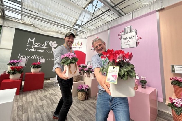 Het team van Morel toont enthousiast hun nieuwste Cyclamen. Area Manager André Costa (links) houdt Petit Moulin vast, een dubbelbloemige cyclaam die bijna 100 dagen houdbaar blijft. Global Sales and Marketing Manager Guy Schertzer houdt een Indiaka Midi in de nieuwe rode kleur vast.