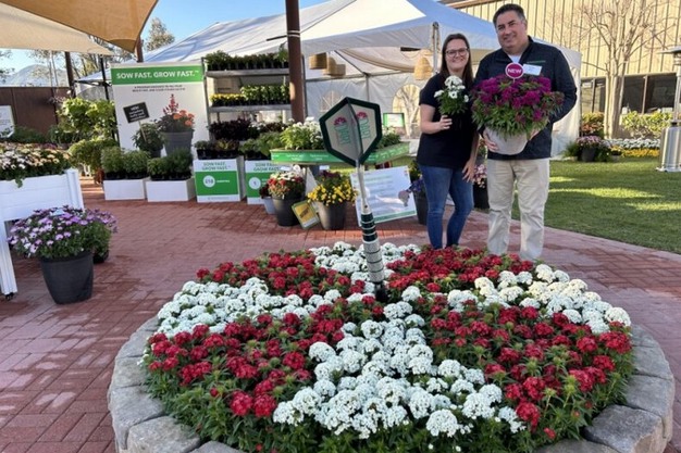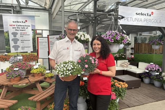 Veel nieuws bij Selecta One Noord-Amerika. Veredelingsmanager Henk Dresselhuys (links) toont MiniFamous Evo Double White uit een nieuwe serie calibrachoa. Manager Manda Vuksanaj-Coker (rechts) is fan van de Dianthus Diadeur Pink Shades vanwege zijn dubbele bloemen en zachte geur.