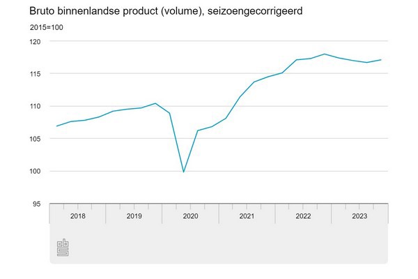 Volgens de tweede berekening van het CBS is het bruto binnenlands product (bbp) in het vierde kwartaal van 2023 met 0,4 procent gestegen ten opzichte van het derde kwartaal van 2023. Bij de eerste berekening, die is gepubliceerd op 14 februari, kwam de groei uit op 0,3 procent. De tweede berekening van het bbp wordt altijd circa 85 dagen na afloop van het kwartaal gepubliceerd.