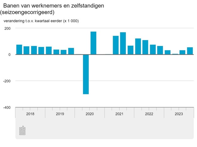 Volgens de tweede berekening steeg het aantal banen van werknemers en zelfstandigen in het vierde kwartaal 2023 met 56 duizend ten opzichte van het derde kwartaal van 2023. De eerste berekening kwam uit op een stijging van 45 duizend banen.