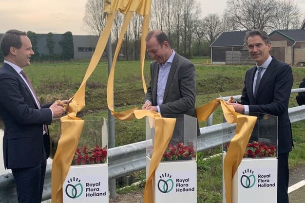 Vlnr: wethouder Bart Kabout, David van Mechelen (CFO van Royal Flora Holland) en wethouder Sven Spaargaren.