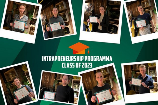 Ruim twee weken geleden vond de afsluiting van de Intrapreneurship Programma Class of 2023 plaats. Acht deelnemers hebben gedurende een jaar gewerkt aan hun startup- & innovatieskills om hiermee het bedrijf waar zij werken tien stappen verder te kunnen brengen. Deze lichting deelnemers is de eerste die officieel het certificaat voor het Intrapreneurship Programma uitgereikt krijgen mét Post-HBO certificering.