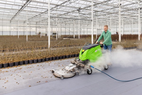 De heetwater hogedrukreinigingsmachine Floorcleaner+ is eenvoudig in gebruik en onderhoud, benadrukt hij. "De machine zorgt voor een grondige reiniging van ErfGoed teeltvloeren met enkel heet water. Het hete water wordt door de machine met hoge druk op de vloer gespoten. De roterende borstels reinigen de vloeroppervlakte intensief. De krachtige zuigfunctie zorgt ervoor dat het losgekomen vuil direct opgezogen wordt, met een schoon en hygiënisch resultaat."