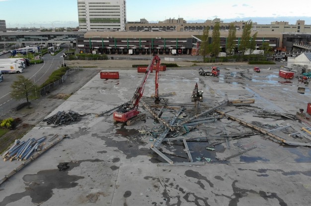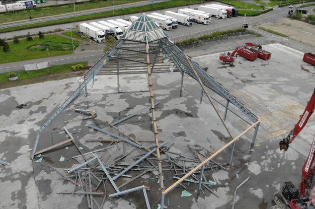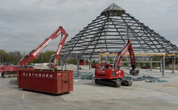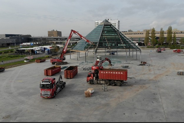 Tholen - Het kwam de afgelopen tijd al geregeld in het nieuws, maar nu is hij er dan echt niet meer, het Pyramide Floral Shopping Center op het veilingterrein van Royal FloraHolland in Naaldwijk. De sloop was in kundige handen van Olsthoorn, die er al met al twee maanden zoet mee was. "Het is helaas niet gelukt de Pyamide door te verkopen", zo laat het bedrijf weten, "maar het staal, glas en aluminium wordt uiteraard gesorteerd en zal worden gerecycled. De afgelopen dagen moest de iconische Pyramide eraan geloven, maar de rest van het in totaal 22.000 m² aan opstanden is wel voor het grootste gedeelte verkocht en zal elders weer opgebouwd worden."