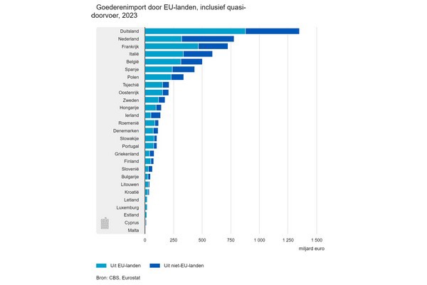 In 2023 importeerde Nederland bijna net zoveel uit niet-EU-landen (458 miljard euro) als nummer één Duitsland (472 miljard euro). Van de totale Nederlandse goederenimport komt 59 procent uit niet-EU-landen. Alleen Ierland importeert naar verhouding meer van buiten de EU (61 procent). Nederland haalt relatief veel goederen uit China, Ierland is meer georiënteerd op de Verenigde Staten en het Verenigd Koninkrijk. Duitsland importeert juist relatief weinig van buiten de EU (35 procent), en veel uit EU-landen, zoals Nederland. In totaal importeert de Europese Unie 39 procent van de goederen vanuit landen buiten de EU.