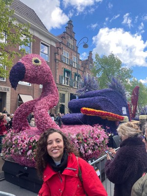 Heloisa, de Braziliaanse stagiaire van Huiberts Biologische bloembollen, besloot een bezoek te brengen aan het bloemencorso. "Toen ik hoorde dat er een bloemencorso was met wagens met figuren gemaakt van bloemen, wist ik dat ik dat niet wilde missen. Zeker omdat er hyacinten waren gebruikt van Huiberts. Dus op naar Haarlem dit weekend." Zij staat op de foto bij dit artikel.