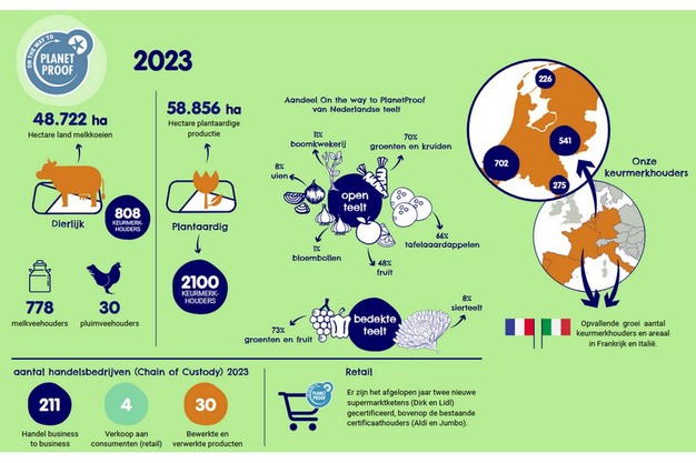 Het aantal telers van plantaardige producten met het keurmerk On the way to PlanetProof is in 2023 stabiel gebleven. Wel steeg het areaal van de keurmerkhouders met 3% naar 58.856 hectare. Bij de ontwikkelingen omtrent dit keurmerk, waaronder een daling van deelname in de sierteelt, stond SMK onlangs al speciaal stil.