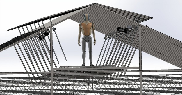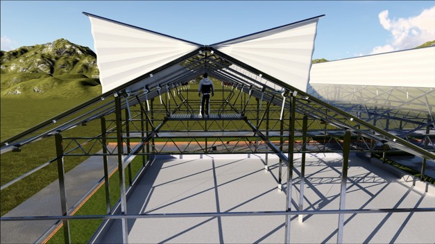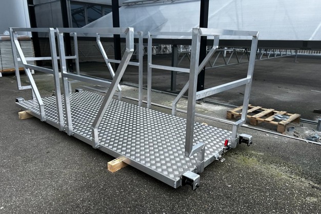 De volgende stap is de folie bij de ventilatieopeningen vastzetten. Opmerkelijk is dat dit van binnenuit de kas wordt gedaan. "Hiervoor hebben we een buisrailsysteem boven het traliewerk ontworpen", toont Jacco. Een werkplatform vliegt bijna als een vliegend tapijt door de kas. Het bestaat uit twee buizen met een kar waarop een werkstation is gepositioneerd met veiligheidsbarrières. Dit platform bevindt zich binnen in de kas. Elke kas wordt geleverd met een werkplatform. "Die kar is ook handig als je planten al op hun plek staan. Je kunt bijvoorbeeld gemakkelijk het insectengaas reinigen, de motor onderhouden of de tandriemen smeren zonder planten te hoeven verplaatsen om erbij te kunnen. Je rolt gewoon over het traliewerk door je kas," vervolgt Jacco.