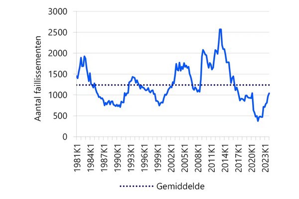 Volgens het CBS is het aantal faillissementen in het eerste kwartaal van 2024 gestegen tot het hoogste niveau sinds het tweede kwartaal van 2020. Het totale aantal faillissementen, inclusief eenmanszaken en gecorrigeerd voor zittingsdagen van de rechtbank, bedroeg 1.038. Dit is het vierde opeenvolgende kwartaal waarin faillissementen stijgen, met bijna een verdrievoudiging ten opzichte van het historische dieptepunt in het derde kwartaal van 2021.