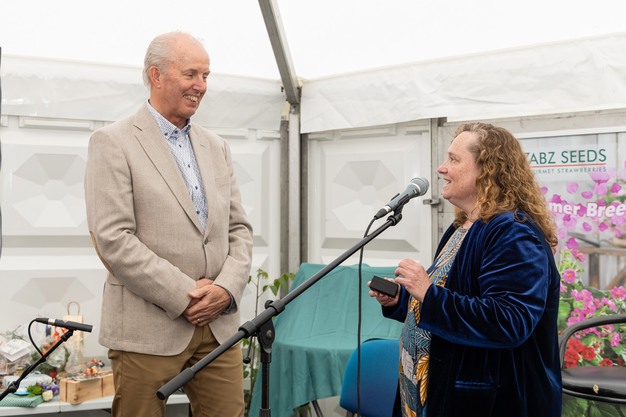 Claudia den Braver van Plantum speld Gé een speldje op voor zijn verdiensten voor de gewasgroep Aardbei.