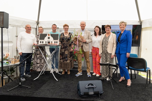 Bij zijn afscheid kreeg Gé namens het team een mooi vogel-villa in de vorm van het "Holland Strawberry House" cadeau. Vlnr Ruud van der Meer, Rinske van Dekken, Paul Doodeman, Karina Commandeur, Gé Bentvelsen, Ilona Smith, Roberta van Oostrum en Ingrid Bakker