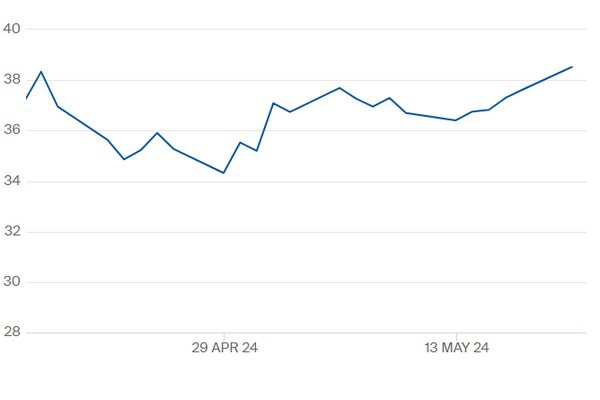 TTF-gasprijs kwartaal 1 2025 t/m 20 mei 2024. Klik hier voor de actuele prijzen op de Title Transfer Facility.