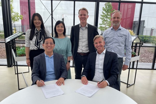 Op de foto van links naar rechts: Dr. R.Q. Huang (President Rui Xue Global) en Guido Janssen (CEO Lumiforte) (beiden zittend); mevrouw Zi Ying Huang, mevrouw Xue Ping Huang (beiden Rui Xue Global), Niels de Groot (CFO Lumiforte) en Barry Zuidgeest (CCO Lumiforte).