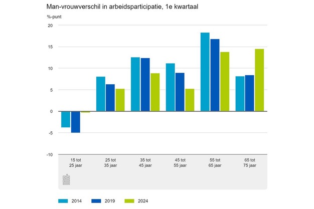 Als gekeken wordt naar de verschillende leeftijdsgroepen is niet overal sprake van een stabilisering van het man-vrouwverschil in arbeidsparticipatie. Bij 25- tot 65-jarigen is het verschil ook recent nog afgenomen. Daarentegen was bij jongeren een omgekeerde inhaalslag te zien. In 2014 lag de arbeidsparticipatie van mannen van 15 tot 25 jaar ruim onder die van vrouwelijke leeftijdgenoten. Die achterstand hebben ze nu ingehaald. En het verschil onder 65-plussers nam toe, doordat de arbeidsparticipatie van mannen sterker toenam dan die van vrouwen in dezelfde leeftijdsgroep. In het eerste kwartaal van 2024 werkte 27,0 procent van alle mannen van 65 tot 75 jaar. Van de vrouwen was dat 12,5 procent. Tien jaar eerder was dat nog respectievelijk 14,7 procent en 5,5 procent.