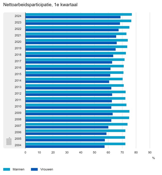 Het verschil in arbeidsparticipatie tussen mannen en vrouwen is de laatste jaren vrijwel gelijk gebleven. In het eerste kwartaal van 2024 had 77,1 procent van alle mannen van 15 tot 75 jaar betaald werk. Van de vrouwen was dat 68,9 procent, een verschil van ruim 8 procentpunt. Vijf jaar geleden, in het eerste kwartaal van 2019, was dat ook al zo. In de jaren daarvoor werd het verschil nog gestaag kleiner, vooral in het eerste decennium van de eeuw. Dit meldt het CBS.