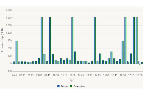 Zaterdag was het weer flink raak met onbalans op het energienet. Tussen 9 en 17 uur tellen we 7 pieken met prijzen tot maximaal 1823 euro per megawattuur, per kwartier. Hieronder de verrekenprijzen die netbeheerder TenneT rekende voor 1 juni 2024.