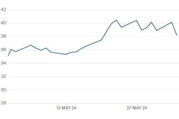 TTF-gasprijs kwartaal 1 2025 t/m 4 juni 2024. Klik hier voor de actuele prijzen op de Title Transfer Facility.