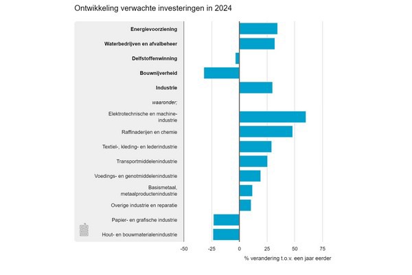 Bedrijven in de energievoorziening zijn het positiefst gestemd en verwachten ruim een derde meer te investeren in 2024. Het gaat om bedrijven die handelen in elektriciteit, aardgas, stoom en gekoelde lucht, of die betrokken zijn bij de productie of distributie daarvan. Ook bedrijven die zich bezighouden met water en afvalbeheer verwachten een dergelijke investeringsgroei. Van de ondervraagde bedrijfstakken is de bouwnijverheid het somberst; bouwbedrijven voorzien een investeringskrimp van een derde ten opzichte van 2023.