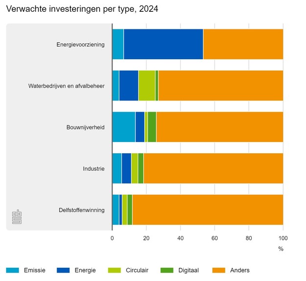 Van de vijf onderzochte bedrijfstakken is het percentage duurzame investeringen het hoogst in de energievoorziening, ongeveer 54 procent. Deze investeringen zijn vooral gericht op energiebesparing. Waterbedrijven en afvalbeheerbedrijven verwachten dat in 2024 circa 27 procent van hun investeringen duurzaam zijn. Hier speelt energiebesparing een grote rol, evenals circulair produceren. In de bouwnijverheid is een vijfde van de verwachte investeringen in 2024 gericht op duurzaamheid. Duurzame investeringen in deze bedrijfstak zijn veelal gericht op het reduceren van emissies.