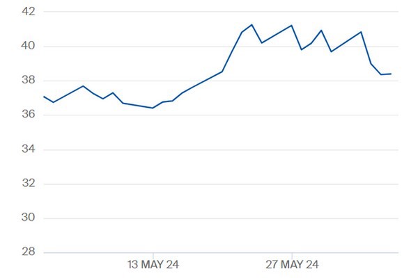 TTF-gasprijs kwartaal 1 2025 t/m 6 juni 2024. Klik hier voor de actuele prijzen op de Title Transfer Facility.