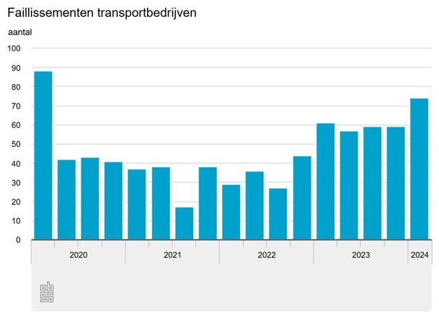 In het eerste kwartaal van 2024 zijn 74 bedrijven in de transportsector failliet verklaard, 13 meer dan in dezelfde periode vorig jaar (+ 21,3 procent). Dit is het hoogste aantal faillissementen sinds het eerste kwartaal van 2020.