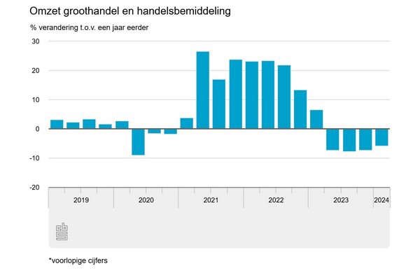 In het eerste kwartaal van 2024 heeft de groothandel en handelsbemiddeling 5,8 procent minder omgezet dan in hetzelfde kwartaal een jaar eerder. De omzetontwikkeling was daarmee voor het vierde kwartaal op rij negatief. Dit meldt het CBS op basis van nieuwe cijfers.