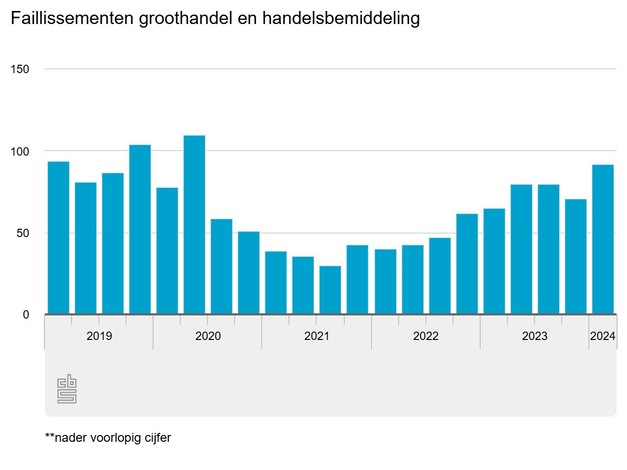 In het eerste kwartaal van 2024 werden 92 bedrijven in de groothandel en handelsbemiddeling failliet verklaard. Ook in het totale bedrijfsleven nam het aantal uitgesproken faillissementen toe in het eerste kwartaal.