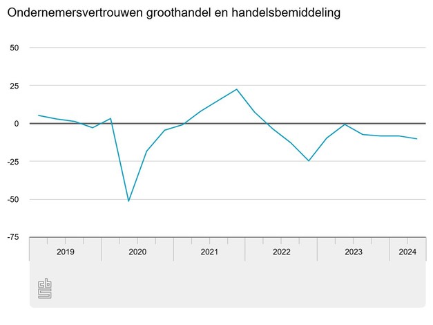 Het ondernemersvertrouwen voor de groothandel en handelsbemiddeling is gedaald. Het ondernemersvertrouwen in de groothandel en handelsbemiddeling was aan het begin van het tweede kwartaal van 2024 -10,2 punten. Daarmee was het vertrouwen van ondernemers 1,9 punten lager dan een kwartaal eerder. Ook het ondernemersvertrouwen voor het totale bedrijfsleven was negatief (-6 punten), maar iets minder negatief dan een kwartaal eerder.