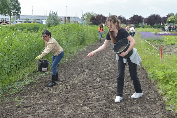 Na afronding van de werkzaamheden rondom de bushaltes, loopbrug en de afslag naar Royal FloraHolland in Aalsmeer zijn nu ook de laatste bermen ingezaaid als Honey Highway. Een aantal collega's van de Dutch Flower Group-bedrijven ging aan de slag om de bermen met de hand in te zaaien voor optimaal resultaat.
