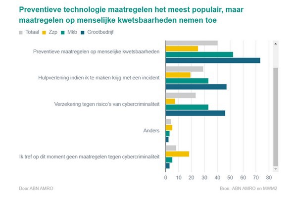 Uit een enquête van ABN AMRO en onderzoeksbureau MWM2 onder 895 organisaties blijkt dat het gros van de ondervraagden maatregelen tegen cybercriminaliteit treft. Onder zzp'ers is dit percentage echter een stuk lager (82 procent) dan onder de respondenten uit het midden- en kleinbedrijf (mkb) en grootbedrijf (respectievelijk 95 en 97 procent). Preventieve maatregelen op technologische kwetsbaarheden zijn, in lijn met de resultaten uit eerdere jaren, onder alle bedrijfsgroottes het meest populair. Voorbeelden hiervan zijn de installatie van virusscanners, het versleutelen van gegevens en het toepassen van firewalls.