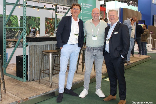 Tomatenteler Erwin van der Lans van Lans durfde het buiten de bouwplaats in Dinteloord wel aan om witte gympen te dragen ;-). Hij wordt geflankeerd door Roland van Gulik van XL Bedrijfskleding en Dennis Flaton van Horti XS.