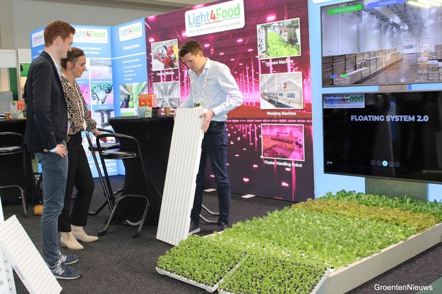 Teelt op water is voortdurend in doorontwikkeling, ook bij Light4Food. Don van Haeff en Niels Jacobs geven uitleg aan Daniëlle Smits van HAS Den Bosch.