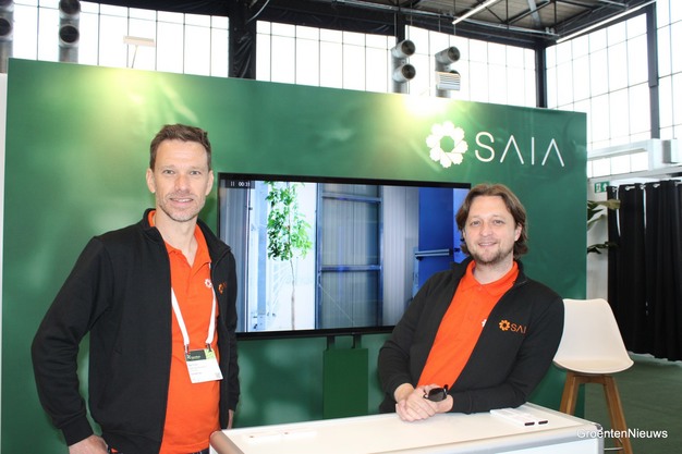 Bas Froon en Ruud Barth van Saia Agrobotics konden weer een stukje meer laten zien van hun robotica-teeltconcept, dat momenteel in een kas in Ede draait. Te zien op de achtergrond op een video: de tomatenplant groeit zonder substraat en is onderweg naar de robot, en niet andersom.