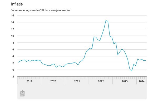 Consumentengoederen en -diensten waren in mei 2,7 procent duurder dan een jaar eerder, meldt het CBS. In april was de inflatie ook 2,7 procent. De inflatie wordt elke maand gemeten als de ontwikkeling van de consumentenprijsindex (CPI) ten opzichte van dezelfde maand in het voorgaande jaar. Het inflatiecijfer van mei is hetzelfde als bij de snelle raming die op 31 mei is gepubliceerd.
