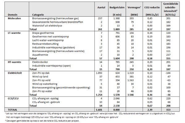 Circa 2 miljard uit de 2023-ronde is gereserveerd voor CO2-afvang en -opslag. De meeste beschikkingen zijn afgegeven voor hernieuwbare elektriciteit, met 1093 zon-PV-op-dak-beschikkingen.