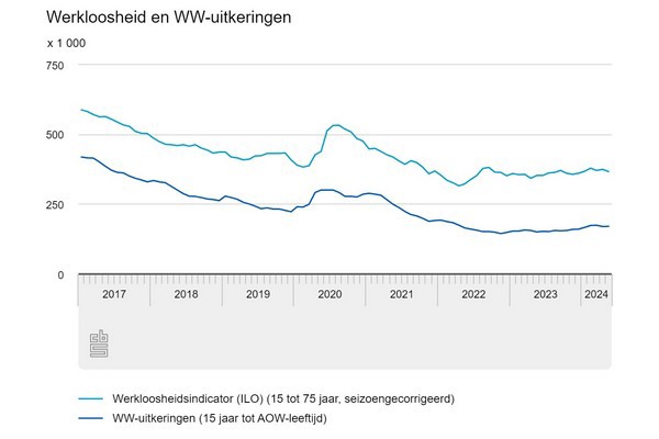 Het aantal werklozen is in de afgelopen drie maanden afgenomen met gemiddeld 4 duizend per maand. Daarmee waren in mei 367 duizend mensen werkloos, dat is 3,6 procent van de beroepsbevolking. In april was dat nog 3,7 procent. Het werkloosheidspercentage schommelt sinds de zomer van 2023 rond de 3,6. Het aantal werkenden is toegenomen. Dit meldt het CBS op basis van nieuwe cijfers. UWV registreerde eind mei 171 duizend lopende WW-uitkeringen, 500 meer dan eind april.