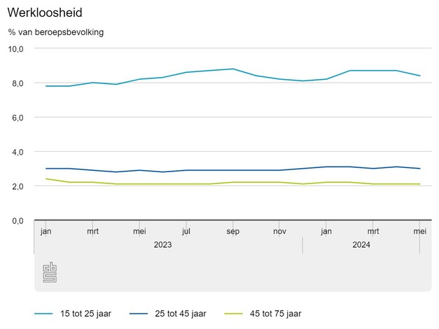 De werkloosheid daalde in mei het meest onder jongeren, van 8,7 naar 8,4 procent van de beroepsbevolking van 15 tot 25 jaar. In deze leeftijdsgroep ligt de werkloosheid aanzienlijk hoger dan bij 25-plussers. In de voorgaande 12 maanden waren er ook grotere schommelingen in het werkloosheidspercentage onder jongeren. Het gaat bij de jeugdwerkloosheid meestal om onderwijsvolgende jongeren die een bijbaan zoeken.