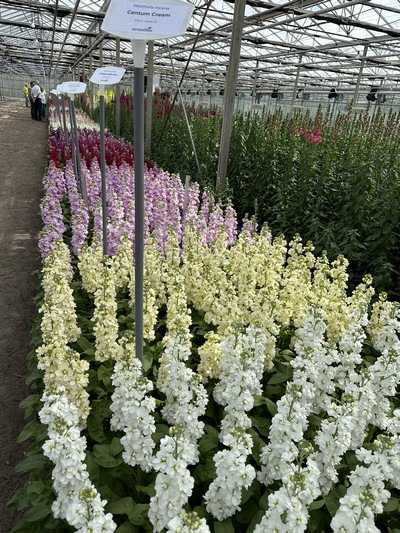 Het team van Evanthia leidt bezoekers rond in de Matthiola en Antirrhinum bloeiproeven bij kwekerij van den Beukel in Monster