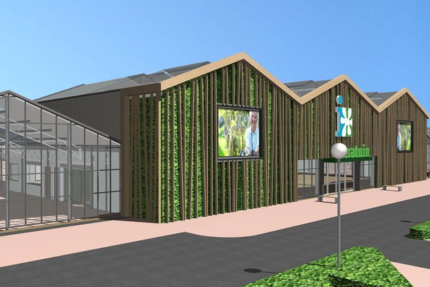 Bij binnenkomst valt straks het moderne atrium op met de diffuse lichtinval en de organische vormen van de achterliggende kantoren op de verdieping. De afwerking met groen en hout sluit mooi aan bij de duurzame uitstraling van het tuincentrum.