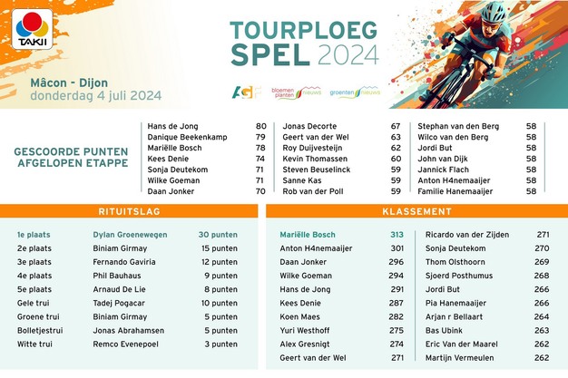 Of Hans de Jong gisteren ook een Nederlandse trui droeg, dat weten we niet, maar dat hij net als de Nederlands kampioen Dylan Groenewegen wat te vieren had gisteren, dat is zeker. Hans werd, dankzij de sprintzege van Dylan in Dijon, dagwinnaar in het Takii Tourploegspel. Ook hebben we in het spel een nieuw geletruidrager: Mariëlle Bosch.
