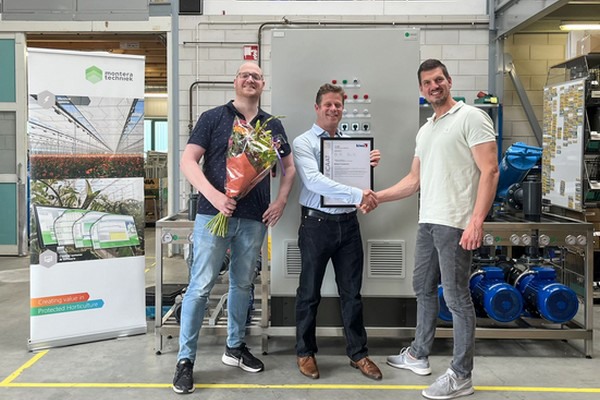 Op dinsdag 10 juli hebben Laurens van Es (Projectmanager) en Rob Vis (Projectcoördinator) van Montera Techniek in Pijnacker het HortiQ-certificaat ontvangen uit handen van Hans van der Salm (Voorzitter van HortiQ). Het installatiebedrijf vindt de stap naar certificering een logische, zegt projectmanager Laurens van Es. "Certificering volgens HortiQ zie je steeds meer als vereiste staan in bestekken, met name in de bestekken van adviesbureaus." Het 51 jaar oude bedrijf is vooral bekend als installateur van water- en elektrotechnische systemen.
