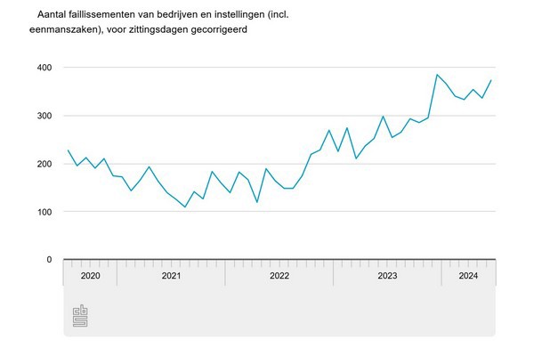 In juni zijn, voor zittingsdagen gecorrigeerd, 37 meer bedrijven failliet verklaard dan in mei, meldt het CBS. Dat is een stijging van 11 procent. In het eerste halfjaar van 2024 zijn er 40 procent meer bedrijven failliet verklaard dan in dezelfde periode een jaar eerder. Het aantal faillissementen was ook hoger dan in dezelfde periode van de laatste drie jaar voor corona (2017-2019).