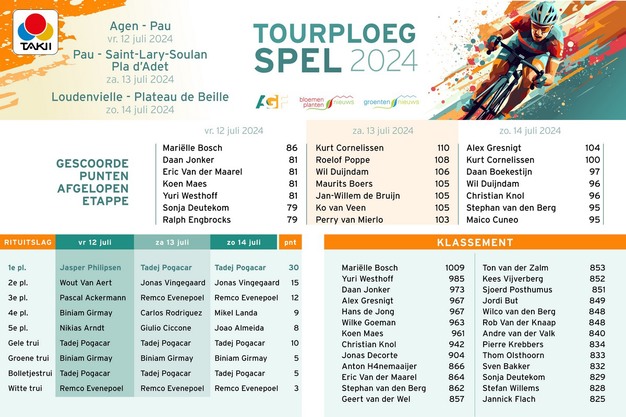 Drie Tourritten verder leverden dagzeges op voor Mariëlle Bosch (vrijdag, opnieuw!), Kurt Cornelissen (zaterdag) en Alex Gresnigt (zondag). Aan kop van het klassement blijft Mariëlle Bosch staan, terwijl in Frankrijk Tadej Pogačar de rustdag viert met een gele trui om zijn schouders.