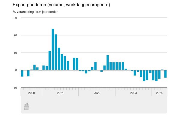 Het volume (werkdaggecorrigeerd) van de goederenexport was in mei 4,3 procent kleiner dan in mei 2023, meldt het CBS. Vooral de uitvoer van machines, aardgas, aardolieproducten en transportmiddelen was lager dan een jaar eerder. Het volume van de goederenimport was in mei 1,7 procent kleiner dan in mei 2023. In de CBS Exportradar van juli waren de omstandigheden voor de export ongunstiger dan in de radar van mei.
