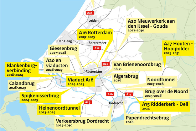 Het snelwegennet van Zuid-Holland ondergaat de komende jaren een forste transitie. Naast een extra tunnel en een stuk snelweg wordt er flink aan de weg gewerkt om bruggen en viaducten te onderhouden. Rijkswaterstaat verwacht de komende jaren dan ook veel vertragingen vanwege werkzaamheden.