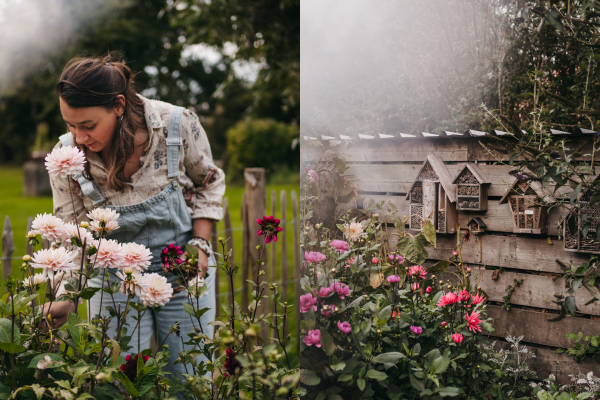 De tuin staat in het voorjaar vol met tulpen, narcissen en allerlei andere bloembollen, maar in de zomer staat er weer ander moois te bloeien, vertelt ze: "Momenteel staan er lathyrus, zonnebloemen, zinnia's en heel veel dahlia's. Ik werk heel graag met dahlia's, want ze zijn er in zoveel verschillende kleuren, vormen, structuren en maten. Sommige hebben puntige blaadjes, anderen zijn weer bolvormig. Ik haal de dahliaknollen bij Zeelanddhalia in Heinkenszand, zij hebben hele bijzondere dahlia's in hun assortiment. Ook gebruik ik de zaden van May & June in de tuin en deze verkoop ik zelf ook in mijn shopatelier. Daarnaast haal ik dahlia's, maar ook de tulpenbollen bij Fam Flower Farm, een grote kweker in de bollenstreek."