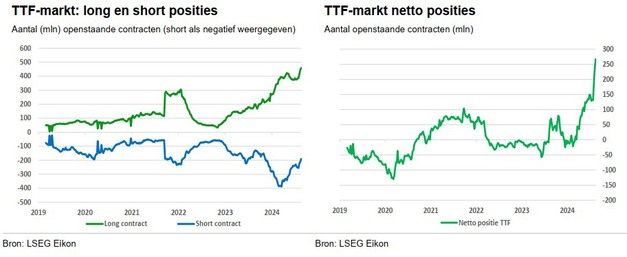 Niet eerder in de geschiedenis van de TTF-handel zijn er zoveel marktpartijen geweest die speculeren, of speculeerden, dat de prijzen verder gaan stijgen. Door het lagere aantal short-posities, in combinatie met het record aantal long-posities, is de netto-positie (long minus shorts) ook op een recordhoogte gekomen (rechter grafiek).