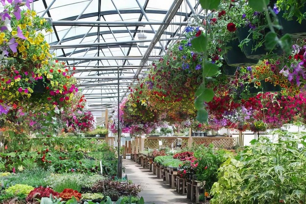 Een foto van de kas van Timberline Gardens, waar ze de verwarmingskosten hebben verlaagd met de Airius ventilatoren