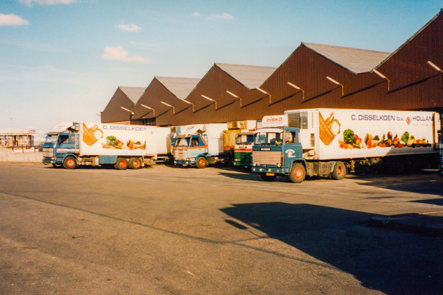 De eigen vrachtwagens van Disselkoen B.V. voor de hallen in De Lier