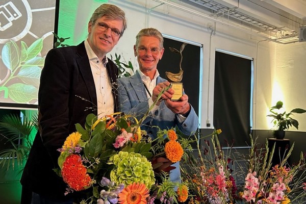 De Plantum Duurzaamheidsprijs werd door Dick Veerman (links) uitgereikt aan Foeke Gardeniers van Dümmen Orange.